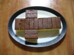 Step 1: Buy 3 cakes and line them up on a plate like a cross, cut one in half for the cross pieces (pound cake and Swiss rolls work)