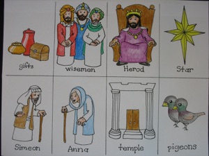 2.Discard the temple, pigeons, and staff. (these pictures are used for a Christmas card game--see 12 more ways to use these downloadable sheets on the right) Cut out all the remaining figures.