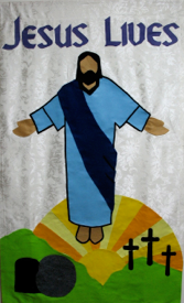 Banners are a great way to dress up the church for Easter and make it feel more like a celebration. If you don’t do anything to make Easter Sunday distinctive, it will feel like every other Sunday. Therefore decorations can be an important part of making Easter special. Some churches hang banners year round, then for special occasions replace them with seasonal banners. It only takes a few minutes to hang a banner, so they don’t take as much time to decorate as other ornaments. If you make your own, you can choose the design that you want, and write the message with the emphasis you want to get across. Unlike flowers, they can be used year after year. Unlike stained glass windows, they are relatively inexpensive to make, so you can make new ones when you want a new look. I highly recommend the pattern books on the right, available through Christian bookstores, and online companies such as Christian Books and Amazon.