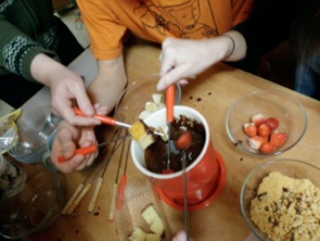 Believe it or not, chocolate fondue is the same as ganache and truffles. Just heat some cream, and melt an equal amount of chocolate into it. You don’t even have to have a fancy fondue pot with a candle under it--it all gets eaten up long before it has a chance to harden. Some of the things we like to dip in the chocolate--cake cubes, cookies, nuts, banana chunks, strawberries, orange slices, marshmallows, dried apricots, etc. If any chocolate were ever to be left over, it could be formed into truffles. If you want to be healthy, you can make it with milk instead of cream--just be sure to use milk chocolate, as the dark chocolate flavor is just too strong (it seems to be o.k. with cream for some reason.)